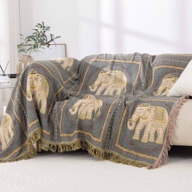 象柄コットンタッセルソファスロー毛布 - リバーシブル、軽量、オールシーズン用カウチカバー、複雑なステッチディテール、ゴールドとブルーのアクセント、フリンジディテール、カジュアルまたは装飾用に最適、デコラティブカウチアクセサリー | 象のモチーフ | 複雑なステッチ