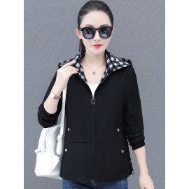 1pc レディース リバーシブル カジュアル ミドル丈 コート、ポリエステル フード付き ジャケット ジッパー付き、長袖 無地 アウター 春/秋用、非ストレッチ生地、レギュラーフィット - 新作