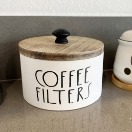 コーヒーフィルタ用の木製コンテナ、蓋付きで、ファームハウス調のデザインで、フィルタを収納し、ファームハウス調のコーヒーバーデコレーションを実現できます。