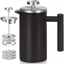 ブラックステンレス製フレンチプレスコーヒーマッカー、ダブルウォール断熱フレンチプレス、コーヒー&ティー用、追加フィルター3枚付き