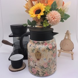 視覚的に魅力的な花柄デザインのステンレス製断熱ティーケトル - 大容量、黒外装、白内装、自宅でのルーズリーフ茶を淹れるのに最適