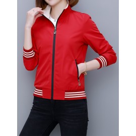 女性用レッドストライプボンバージャケット、ポリエステル素材、カジュアル