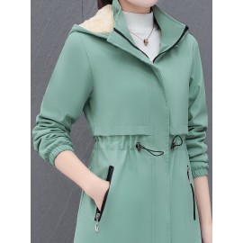 女性用ミッドレングスフリース裏地ウォームフード付きコート - カジュアルポリエステル、サイドポケット付きジップアップ、秋冬用長袖