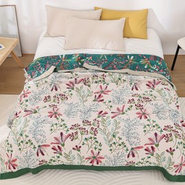 リバーシブルコンテンポラリーフローラルコットンブランケット - オールシーズンファインコットン織り、洗濯機洗い可、多目的フラワー柄ベッドブランケット、純綿充填とカバー、32本スティック織り職人技