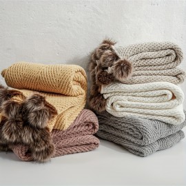 ヴィンテージ風チャンキーニットスローブランケット、ポンポン装飾、宇宙テーマ、オールシーズンポリエステルカバー、ニットカジュアルオフィスリビングルーム寝室昼寝ソファベッドエンドブランケット 1枚