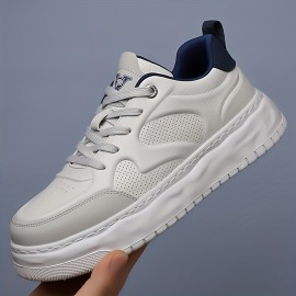 メンズカジュアルスニーカー - ホワイト&ブルーの厚底レースアップミッドトップシューズ、ラウンドトゥ、PUアッパー&ゴムソールで快適なオールシーズン履き心地、おしゃれなレースアップ | ファブリックライニング