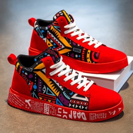 mensハイカットスケートスニーカー、赤い幾何学模様、快適性抜群