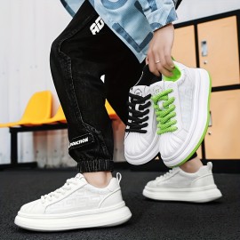 メンズ サマーカジュアルスニーカー - 通気性のあるロートップアウトドアシューズ、厚手ラバーソール付き、ホワイト&ネオングリーンアクセント、PU/ファブリックアッパー&レースアップクロージャー、ハイキング・ストリートウェア・日常使いに